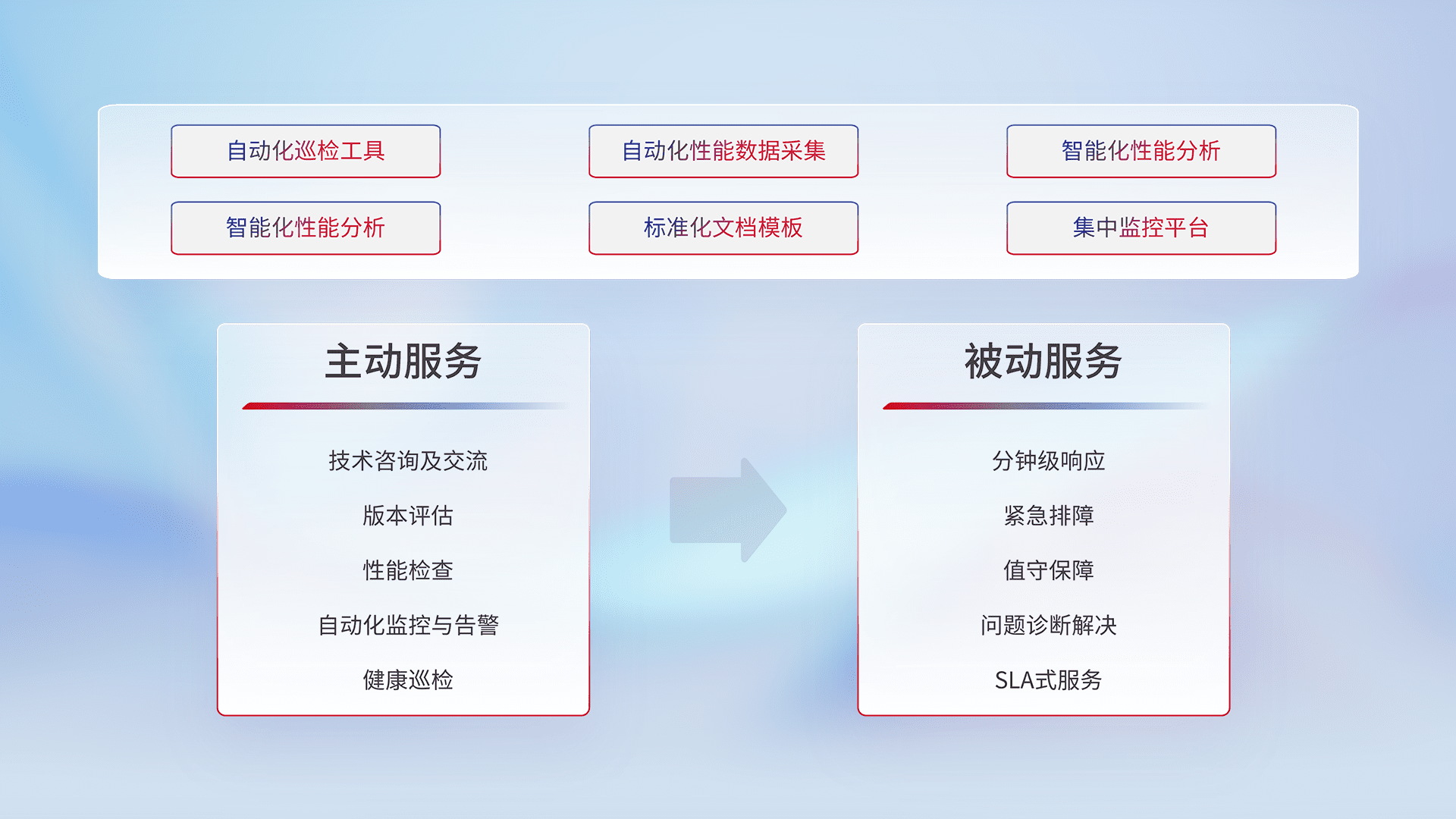 智能化工具和标准化文档,,,保障服务质量,,提供主动服务(包含技术咨询、、、版本评估、、性能检查、、、自动化监控与告警、、健康巡检)和被动服务包含(分钟级响应、、、、紧急排障、、、值守保障、、、、问题诊断解决、、SLA服务)。。。